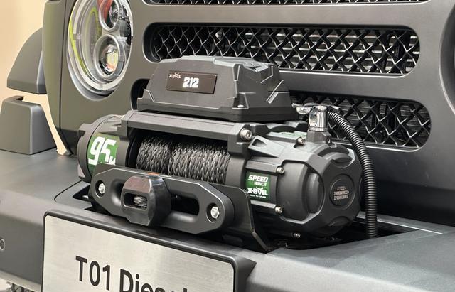 外观设计方面,212 T01柴油版车型延续了212家族经典的设计语言,前脸部分的蚌式发动机盖、防空灯、三段式中网,以及分体式圆形前大灯与长方形转向灯的组合,高度还原了老款212的复古特征,同时也视觉上也给人硬派的越野气息。同时,透镜大灯和 LED 转向灯等现代化装备的加入,在保留复古韵味的基础上,提升了照明效果与实用性。值得注意的是,新车还新增加了前绞盘,这点是国产版本没有的,进一步强化了其越野属性。