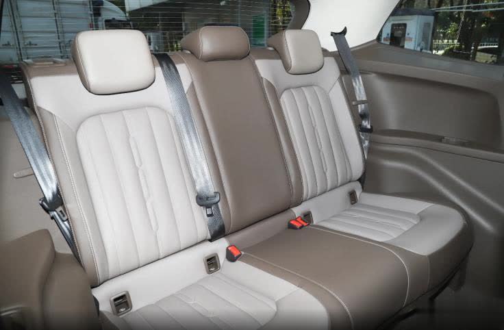 在空间方面,得益于超3米1的轴距设定,中低配大众威然的二排纵向空间较为可观,身高1米77的成年男性将前排座椅调节到舒适的位置后,坐在二排区域,腿部空间大约还能空余出3拳以上的活动距离,而且二排独立座椅两侧扶手支撑性良好,杯托的拉取也很方便,但是没有手机的放置设计,乘车便利性有待进一步提升。至于座椅感受,坐感扎实,坐垫前端支撑突出,靠背的包裹感良好,只是头枕偏生硬,长途久坐可能不及零重力座椅更为舒坦。三排座椅的纵向空间表现较好,同一位体验者调节二排座椅到正常坐姿后,在三排依旧可以轻松翘起二郎腿,只是头部空间不够宽裕,三排中间靠背也偏硬,若能针对这两处设计进行优化,无疑体验会得到提升。