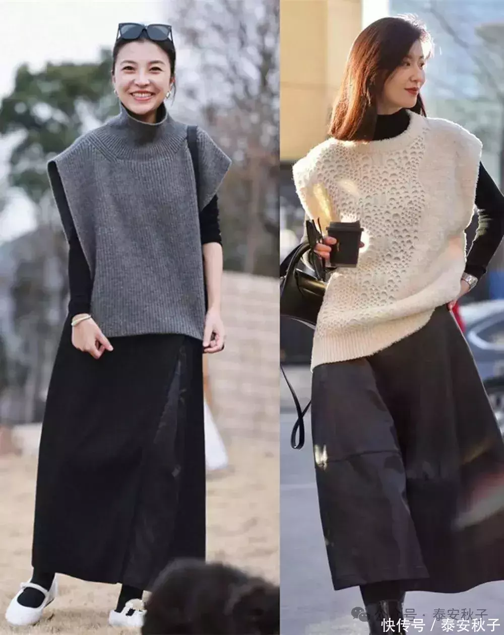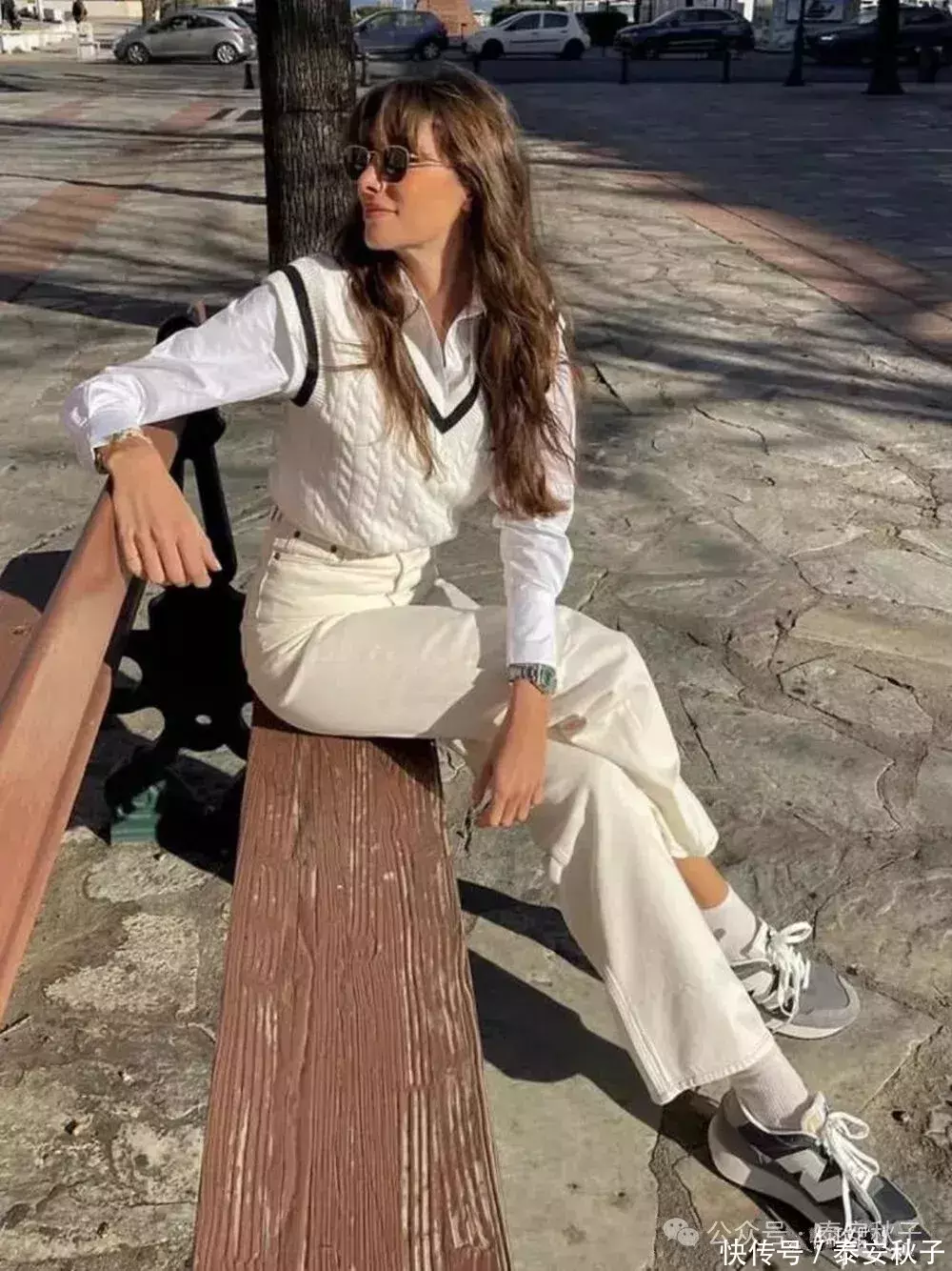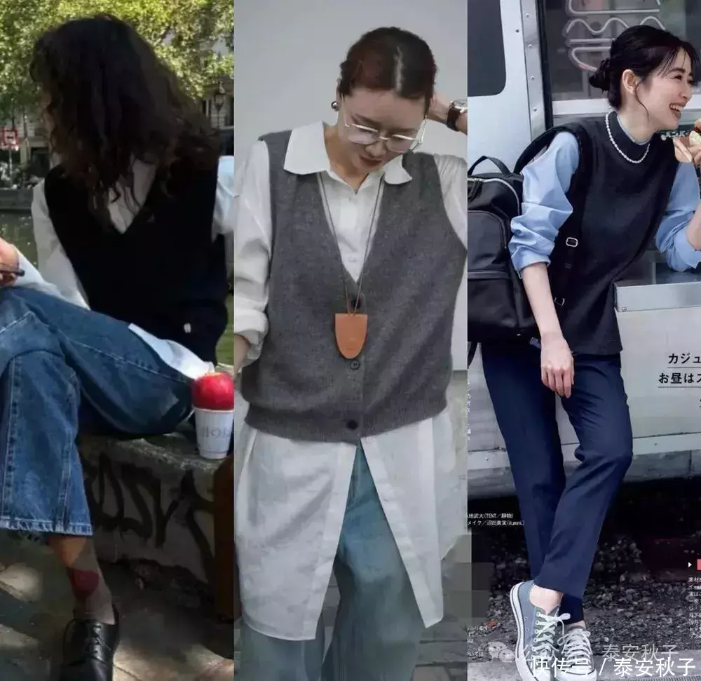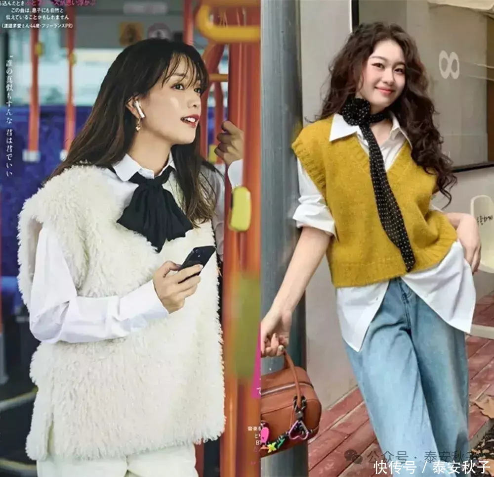 日常上班的时候,可用白色马甲与白衬衫的叠穿,清清爽爽的配色既显优雅气质,又非常减龄。