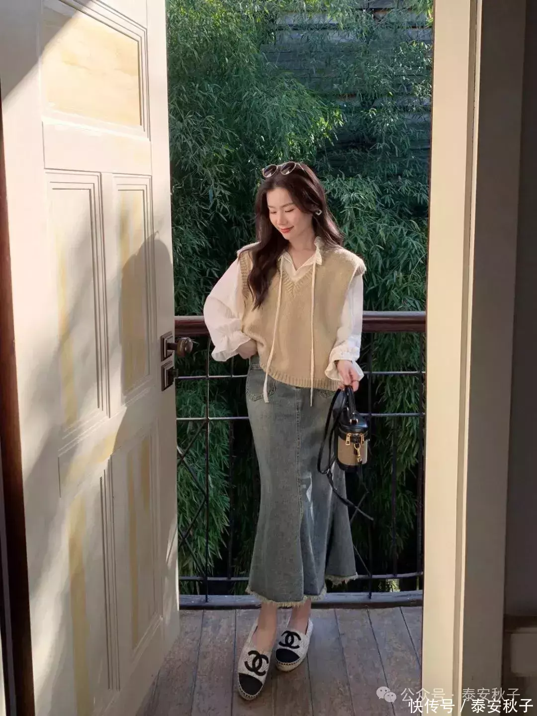 燕麦色针织马甲叠穿了件白色衬衫,看起来低调又干净。选了水洗蓝色的牛仔鱼尾裙作下装,不仅展现出了俏皮灵动的少女感,又有种学院风的味道,减龄效果很OK。
