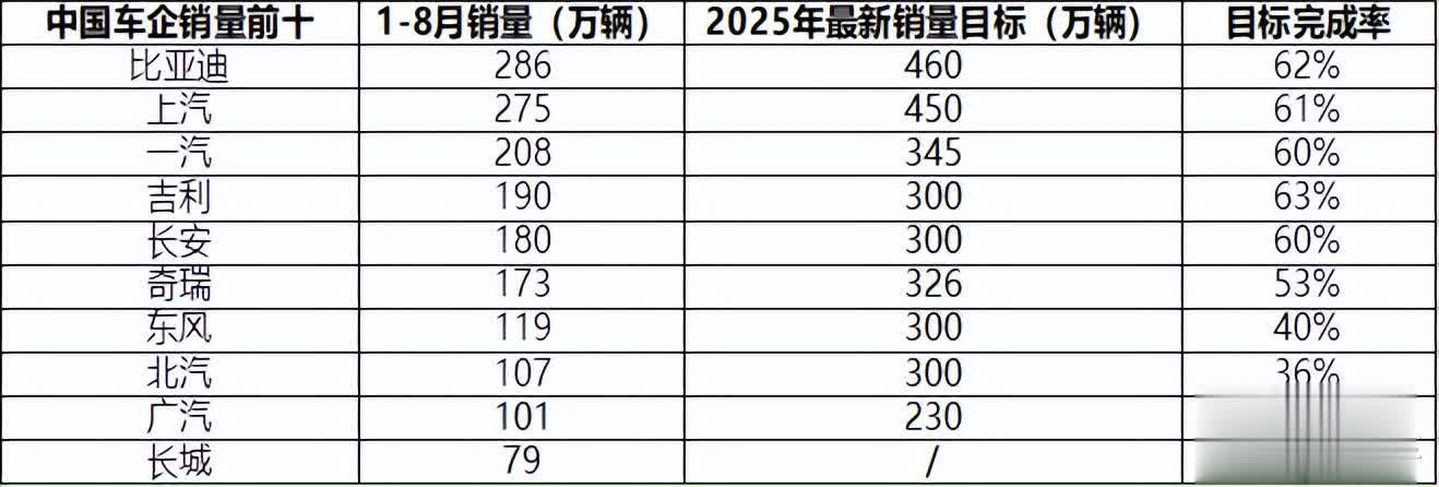 今年1-8月,比亚迪卖了286万辆,完成了全年460万目标的62%,稳坐第一。吉利也挺猛,190万辆的成绩,达成全年目标的63%,是目前完成率最高的品牌。上汽、一汽、长安也都保持在60%以上,算是跟上了节奏。